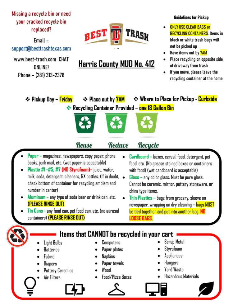 Best Trash will provide each current residence with one recycling bin. Best Trash will replace any bins that are defective or otherwise become unusable due to normal wear and tear. Lost or stolen recycling bins can be replaced at $20.00 plus tax by calling Best Trash.